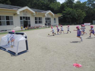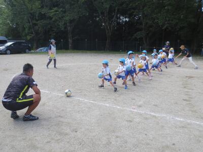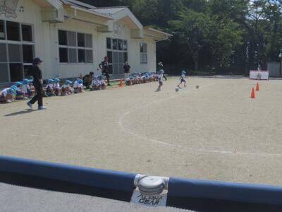 また、年中はクラス対抗の運動会の種目のように、クラスから一人ずつでて、中央のコーンまでドリブルし、コーンをタッチした後、ゴールに向けてドリブルしゴールする活動も行いました。