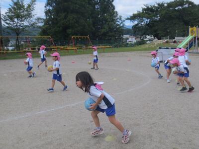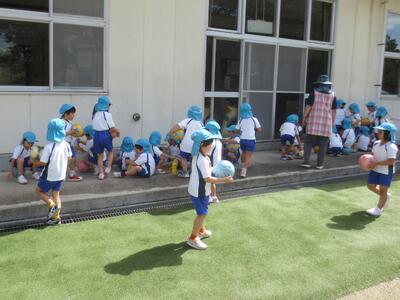 年中・年長ともに、ボールを使っての運動とコーチのアイディアによる楽しいボールコントロール運動を行いました。