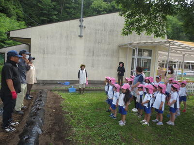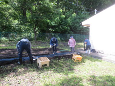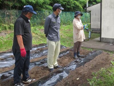 それに向けて、今月4日に村内にお住いの3名のボランティアさん(緑川さん、小野さん、石井さん)に、園の畑に4列のマルチがけをしていただきました。