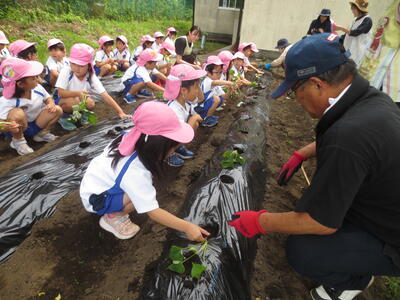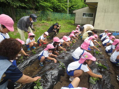 これから年長組では、土の乾き具合を見ながら水やりをしたり、育ってきたら蔓返しをしたりして、秋の収穫まで栽培活動を行っていきます。