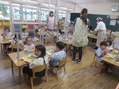 好きな遊びを行ったり、遊戯室でクラス活動を行ったり、一緒に給食を準備し給食を食べたりしました。