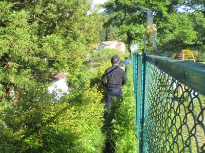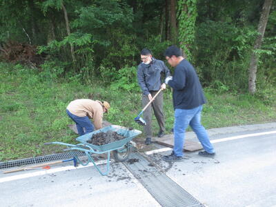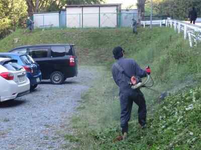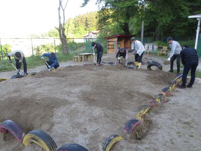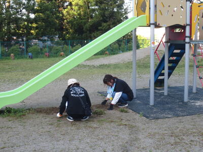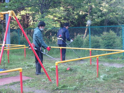 作業時間は朝6時から約1時間程度。園庭遊具周辺の除草をはじめ園敷地内外や駐車場法面の除草、側溝のどぶさらい、園児用砂場枠のタイヤ位置替えや砂おこしを行っていただきました。