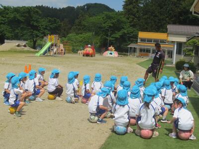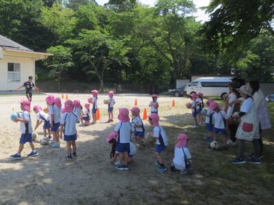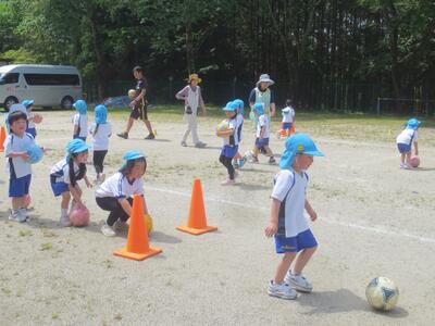 年中組は初めて、年長組は今年2月上旬以来ですので、第1回目の今日は両学年ともボールを使った準備運動やボールコントロールの初期運動を中心に行いました。
