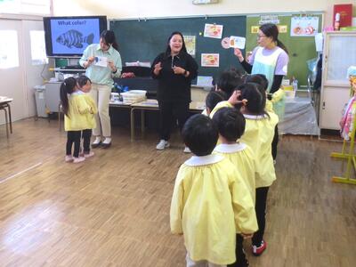 子どもたちは10種類の英語表現をよく覚えていて、絵カードを見たら先生が言う前に「green」「orange」などと表現していました。今回も楽しく活動しました。