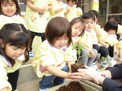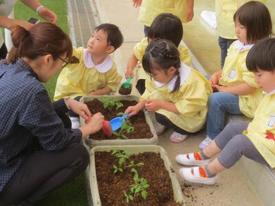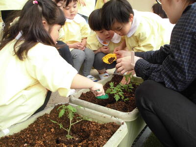 苗を植えながら、みんなで「大きくなれ、大きくなあれ」、「おいしくなあれ、おいしくなあれ」。