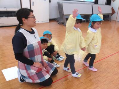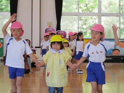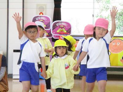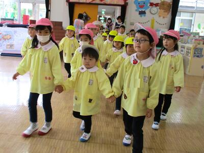 年少組の子どもたちは年長組のお兄さんお姉さんと手をつないで会場の遊戯室に入場しました。