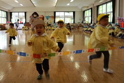 そして、メインのかけっこ。まずはお手本で年長組から、そして年中組、最後に年少組。