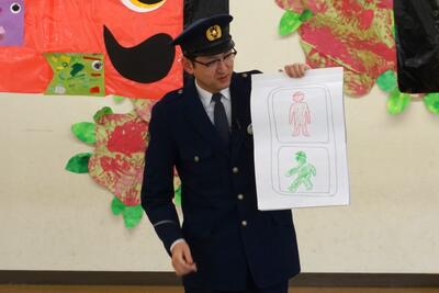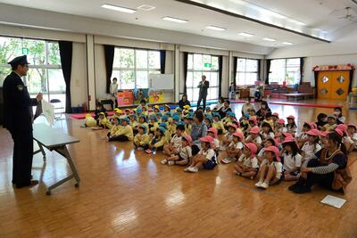 今回は須賀川警察署天栄駐在所の高久所長さんにおいでいただき、交通安全のお話を聞き、横断歩道のわたり方をみんなで確認しました。