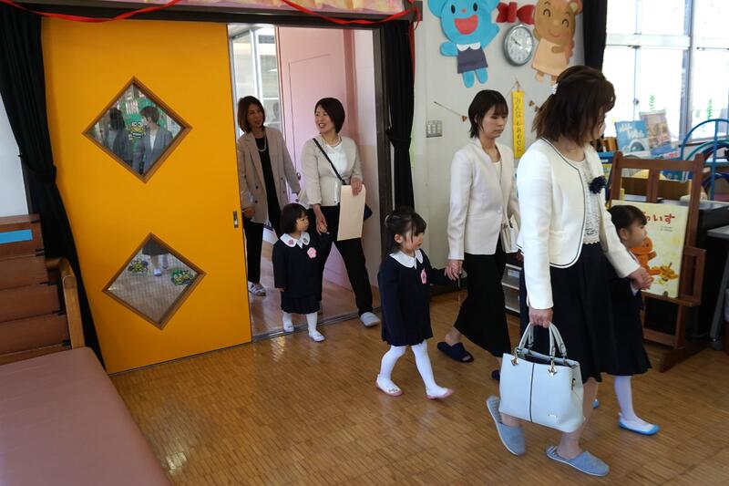 年少組も、年中組も、電車のように並んで「失礼します」と順に入室。