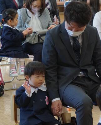 【新入園児入場】新入園児は保護者の方と一緒に式場に入り、式の開始を待ちました。