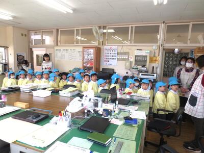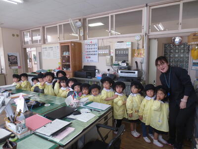 「ここが職員室です。先生たちのお部屋です。」と紹介され、「へ~、そうなんだ。」と言わんばかりに周囲を見渡していました。