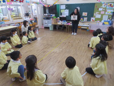 前回の復習で、1~12の数字の英語表現を復習した後、先生が用意した補助プリントを使って、数字が付されたドットをたどって絵を描きながら数字の英語表現を行ったり、カードを使っったりして英語表現を楽しみました。