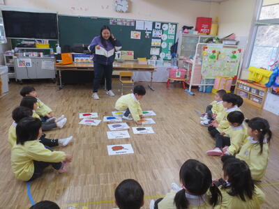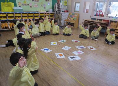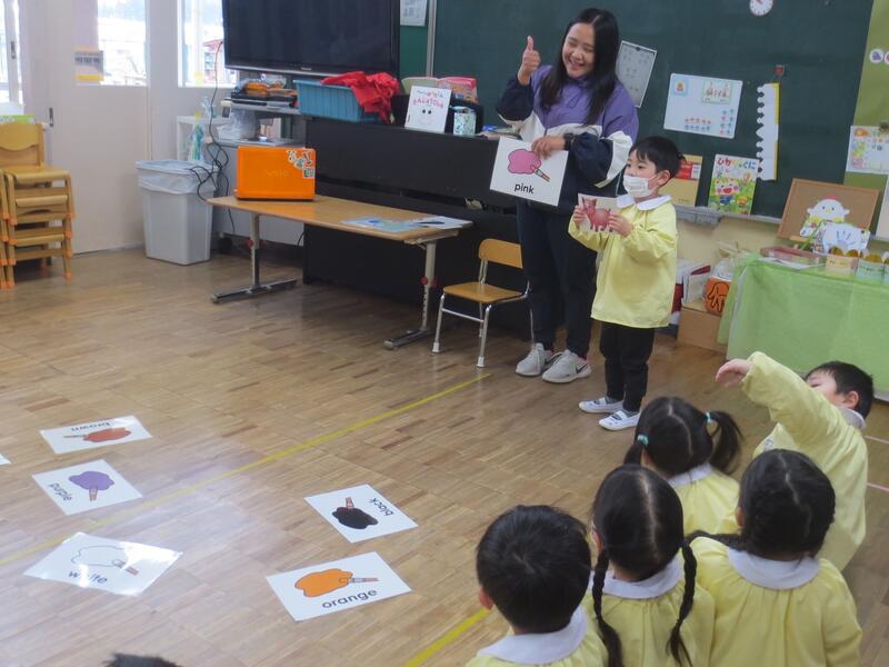 先生が持っている色が塗られていない動物やキャラクターのカードを見て、子どもたちは10種類の色カードからそれに合う色を選んで英語表現をしました。