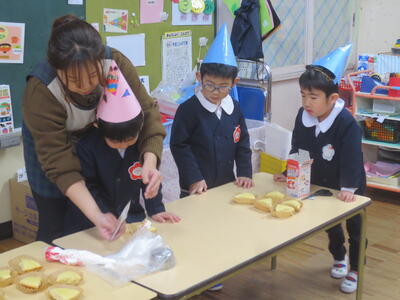その瓶のビー玉がいっぱいになったとのことで、きりん組とうさぎ組それぞれのクラスで、炊飯器を使ったカップケーキ作りをしました。出来上がった生地に生クリームやチョコチップを少々かけてデコレート。