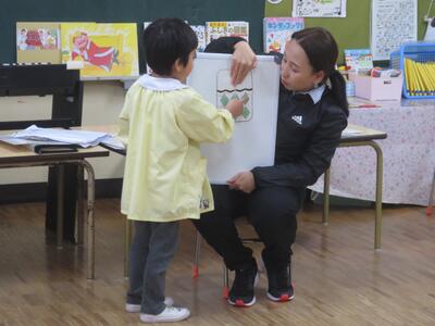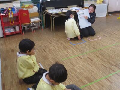 そして、4分割した数字の絵カードを用いてパズルを組み立て、みんなに絵カードの数を紹介する活動も行いました。