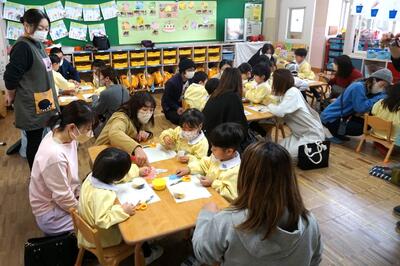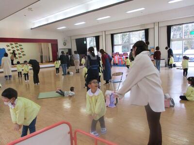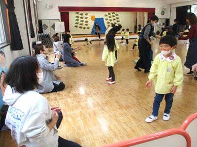 遊戯室で、ふれあい遊び、わらべ歌、新聞じゃんけん、そして今年度の発表会で年中組の子どもたちが披露した昆虫太極拳のダンスを一緒に行いました。その後、R6PTA役員選出も行いました。