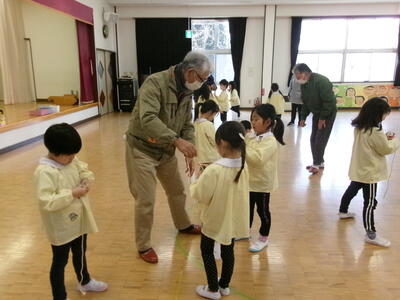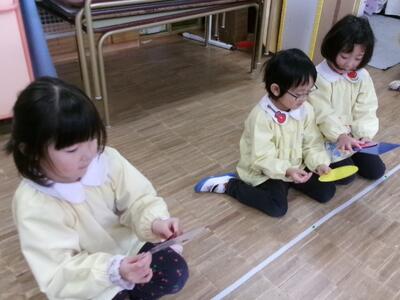本日、今週末に年長組で開催しますこま回し大会に向けて、3名のボランティアさんによる特訓練習会第3回目を行いました。