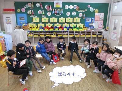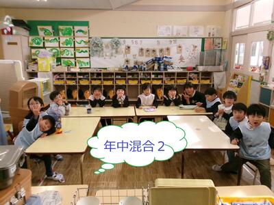 1月の後半、年中組ではきりん組とうさぎ組をシャッフルして、2つの混合クラスで給食を食べるときがあります。