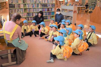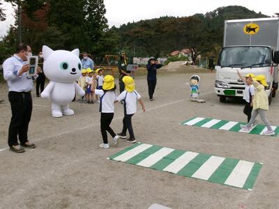 そして、簡易横断歩道を使って、横断歩道のわたり方を学びました。「右見て、左見て、また右見て」をキャラクターのシロネコちゃんが見守る中、全員で体験しました。