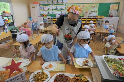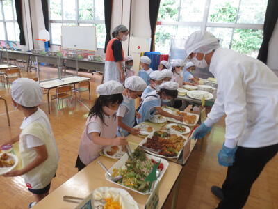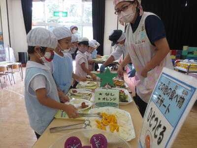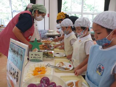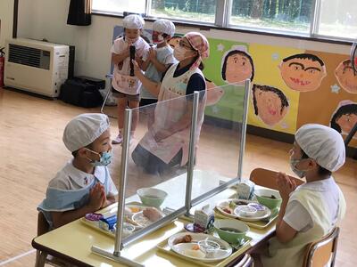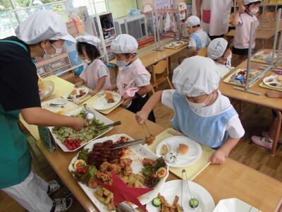 本日は、湯本幼稚園のお友達と一緒に4年ぶりにバイキング給食を行いました。