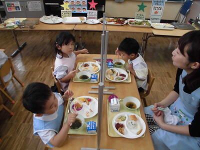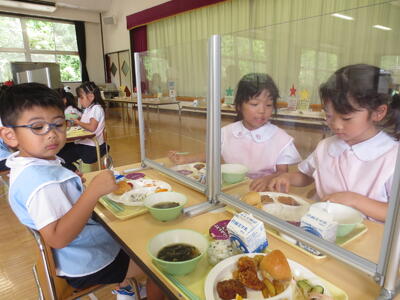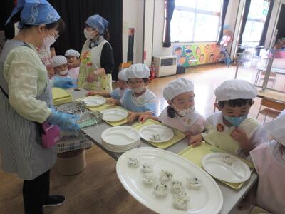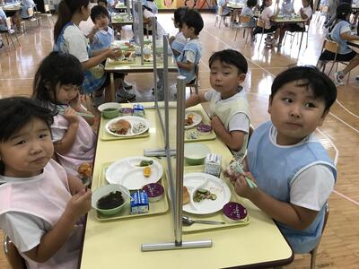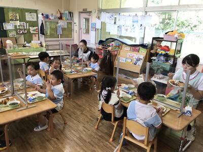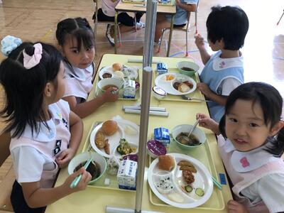 年少組は各クラスで、年中・年長組は遊戯室で食べました。