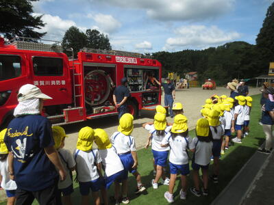 題材は「消防車」。須賀川消防署長沼分署より消防車が来てくれました。