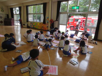 その後、場所を遊戯室に移動し消防車を見ながら、クレヨンで思い思い描き始めました。