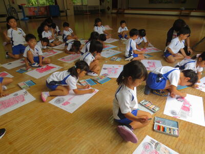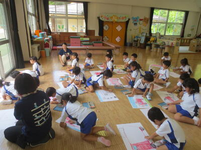 年中・年少組では、用紙サイズを年長組の1/2、1/4にして各クラス活動の中で描きました。