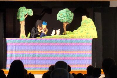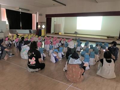 会場は遊戯室で、劇団すぎのこによる「うさぎとかめ」、「おむすびころりん」の2つの人形劇を鑑賞しました。