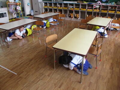 園内放送で「地震です。地震です。」と非常地震警報がなり、各クラスでテーブルの下に身をひそめました。
