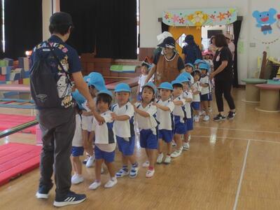 劇が終わり、遊戯室を退出する子どもたを、劇に登場したお人形たちが見送りをしてくれました。