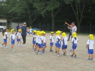 年長組の活動途中に雨が降ってきたので、すぐに活動場所を遊戯室に変更し、ゲームを再開。