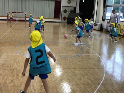 後半は年長組。準備運動を行い、後半は男女別のクラス対抗のミニゲームを行いました。