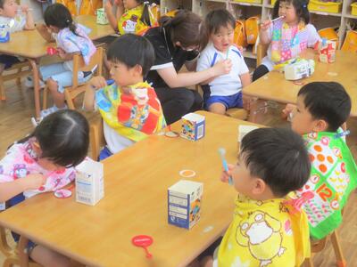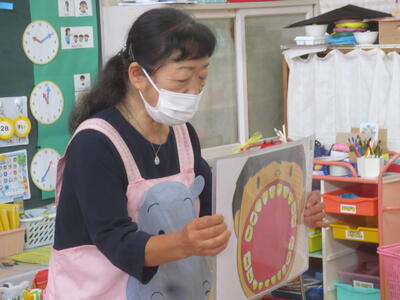 クラスごと、エプロンシアターや歯のモデルや紙芝居を使って、歯ブラシの大切さや正しい磨き方を教えていただきました。そして歯磨きとうがいの仕方を実際に行い学びました。