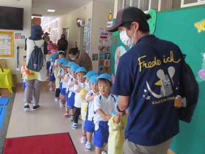 今年度第1回目避難訓練を行いました。年少組の子どもたちにとっては初めての避難訓練でした。第1回目なので