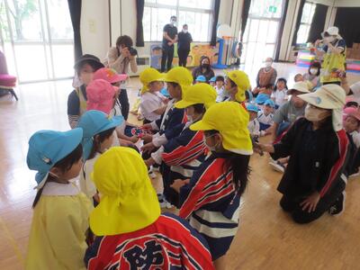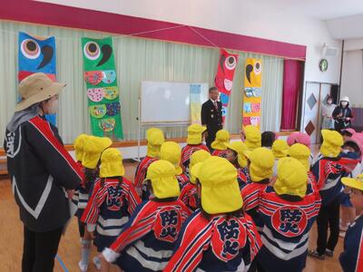 避難訓練後、遊戯室にて、本園消防クラブ入団式を開催しました。