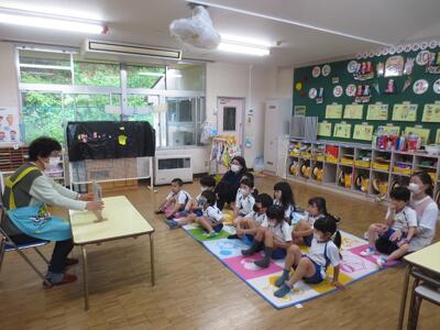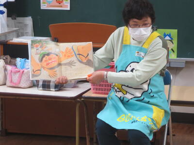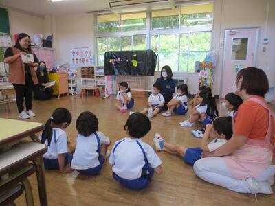 その代わり、文化の森で予定していましたボランティアさんによる絵本の読み聞かせを、本園年長各クラスで行いました。