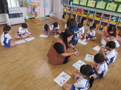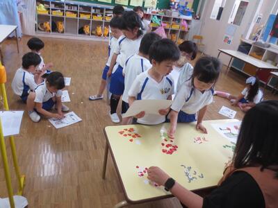 「carrot pleease.」と欲しい野菜を先生に言い、先生から果物シールをもらって、買い物カートプリントに貼る活動を行いました。なかなか高度な活動が続きましたが、子どもたちは自然な形で取り組んでいました。子どもたちはすごいです。