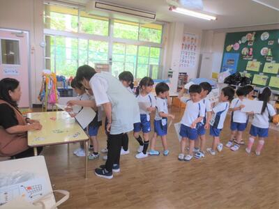 雨が降っていなければ、今日の年長組は園外保育で村学校給食センターと文化の森てんえいを訪問する予定でしたが、あいにくの強い雨となりましたので、本日の園外保育は中止となりました。
