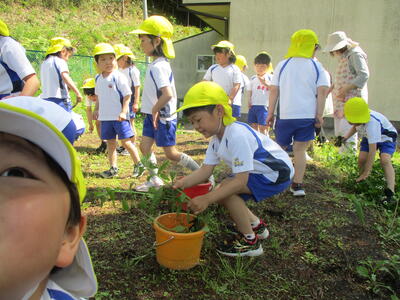 <今年は、まず5月17日に年長組で畑の除草作業を行いました。>