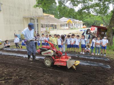 耕運機で土を柔らかくし、肥料を加え耕し、マルチをかけていただきました。