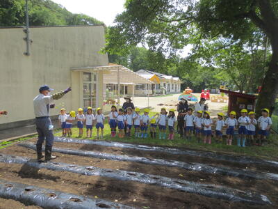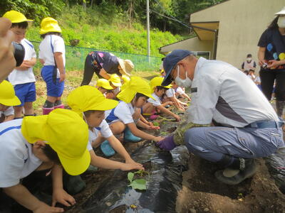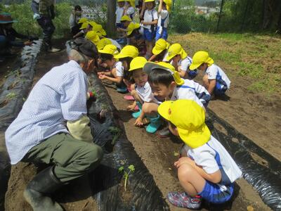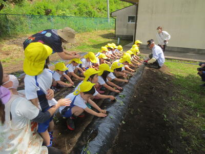 本日、年長組で園敷地内にある畑にさつまいもの苗を植えました。