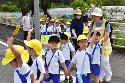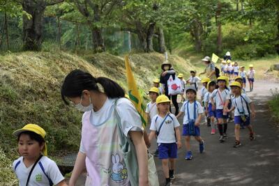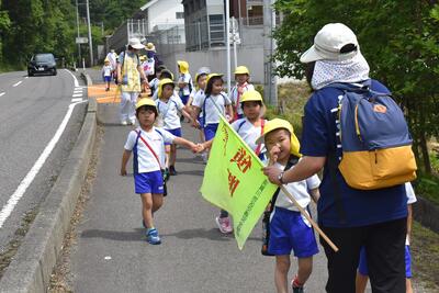 【移動の様子】車の往来がほとんどない近見を往復しました。クラス単位で二人ペアで手をつなぎ、安全にも気をつけながら移動。横断歩道を渡る際には、先日の交通教室を思い出し手を高く上げて横断しました。