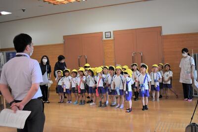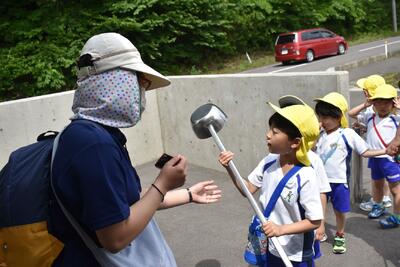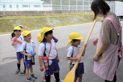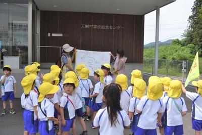 この日、文化の森で予定していたボランティアさんによる読み聞かせは当日園で行ったところですが、今週前半は週予報でよい天気となる情報があったので、本日年長組で園外保育として村学校給食センターと文化の森てんえいを訪問しました。