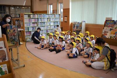 【文化の森てんえいにて】到着のご挨拶をした後、図書コーナーで大きな絵本の読み聞かせを行いました。