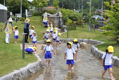 【役場前広場で、お楽しみ】少しの時間でしたが、村役場前のふれあい広場の芝生や水場で遊びました。