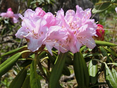シャクナゲは常緑性の花木です。シャクナゲの原種が19世紀中期、プラントハンターによって中国から西欧にもたらされ、その花の美しさと豪華さで当時の人々を驚嘆させ、数多くの交配が行われてきました。これまで世界各地で5000を超す園芸品種が作出され、西洋では春を彩る花木として庭に欠かせない存在となっています。
