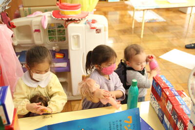 3人でおままごと 幼稚園にはたくさんおもちゃがありますね