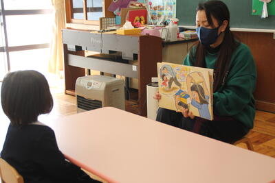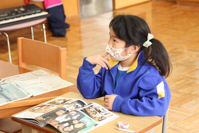 幼稚園では紙芝居を見て考えました。