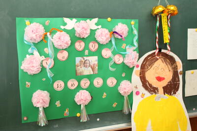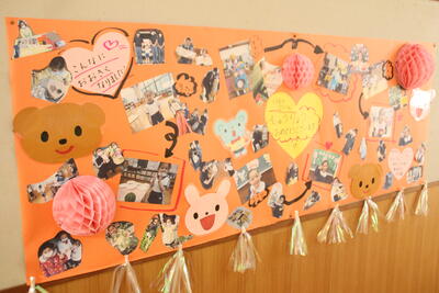 教室や廊下には年中ひまわり組Rさんの修了をお祝いする手作りの掲示がたくさん